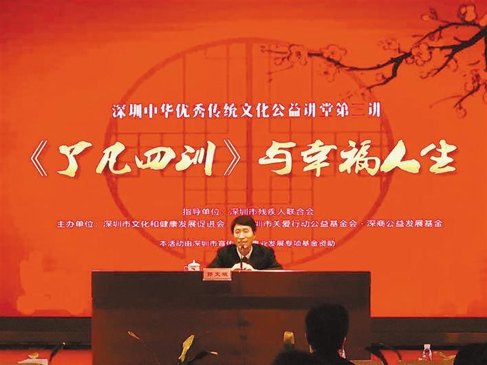 深圳商報(bào)2019年03月18日訊 (記者 夏和順/文 韓墨/圖)近日,深圳中華優(yōu)秀傳統(tǒng)文化公益講堂第三場在深圳市殘疾人綜合服務(wù)中心開講,這也是傳統(tǒng)文化講堂首次“送課上門”。著名作家郭文斌與市殘聯(lián)系統(tǒng)200多名干部分享“東方勵(lì)志奇書”《了凡四訓(xùn)》所蘊(yùn)含的人生哲理,探討“安詳生活理念”與幸福人生的關(guān)系。據(jù)介紹,本次活動(dòng)由中華炎黃文化研究會(huì)文明傳承委員會(huì)、深圳市文明辦指導(dǎo),深圳市文化與健康發(fā)展促進(jìn)會(huì)主辦。