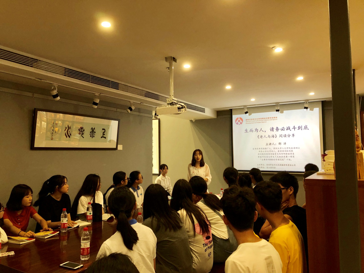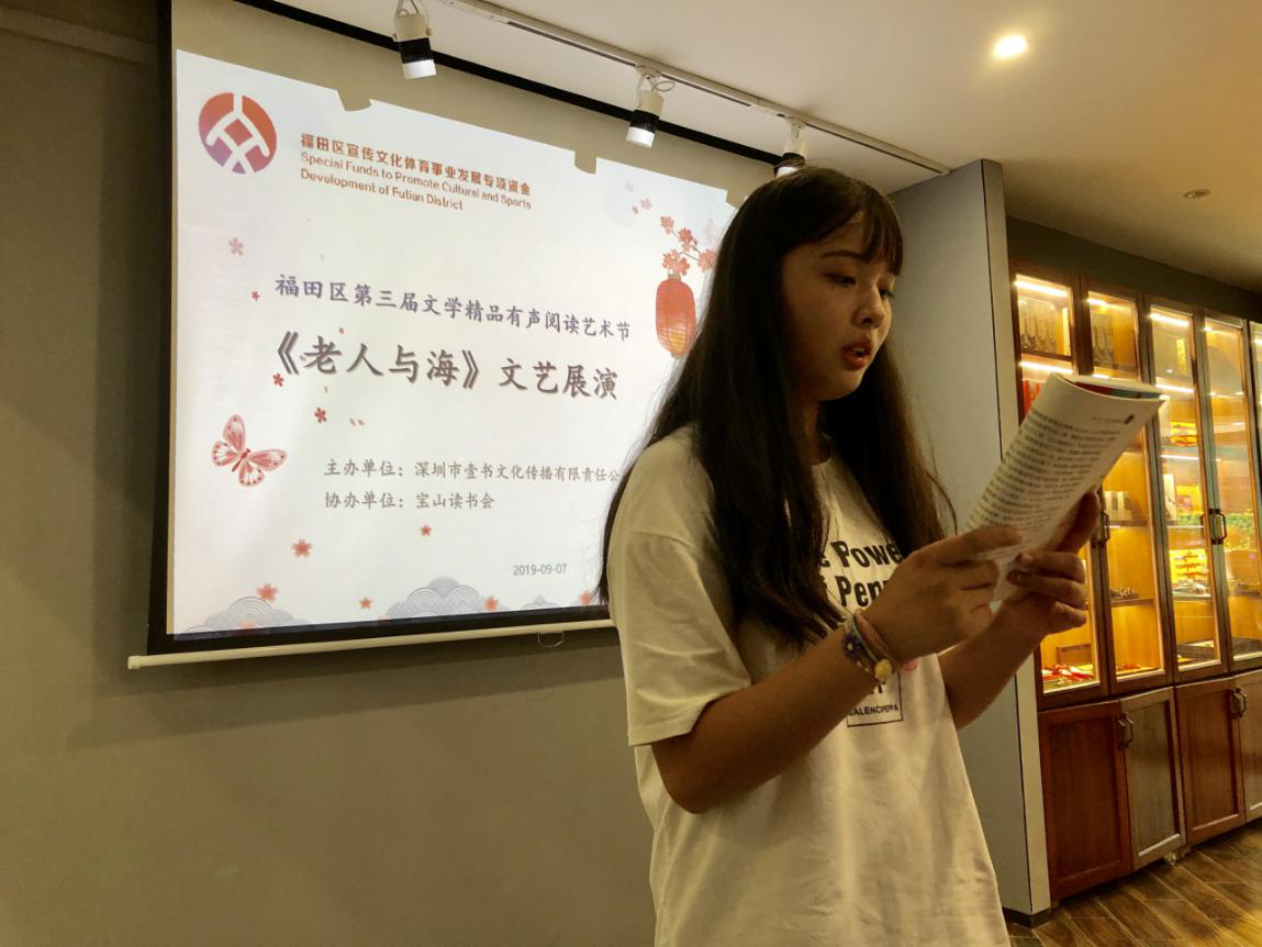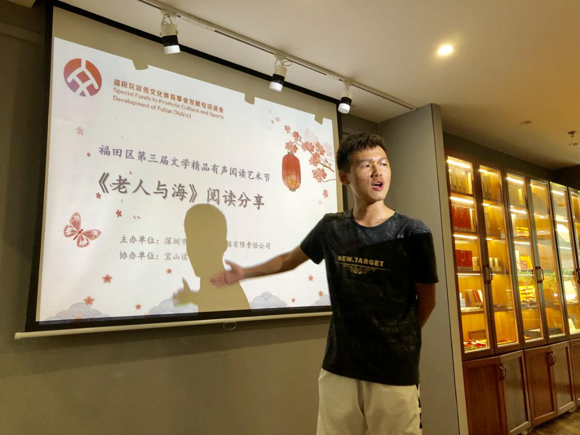 深圳新聞網(wǎng)訊 2019年9月7日,由深圳市壹書文化傳播有限責(zé)任公司主辦、寶山讀書會協(xié)辦的“福田區(qū)第三屆文學(xué)精品有聲閱讀藝術(shù)節(jié)”之《老人與海》閱讀分享會暨文學(xué)作品朗誦會在簡閱書吧香蜜湖店成功舉辦。來自深圳市寶山技工學(xué)校的學(xué)子們在主講人的啟示下分享閱讀感悟、誦讀精彩文摘,在文藝展演中體會圣地亞哥抗擊命運的人生哲學(xué)。