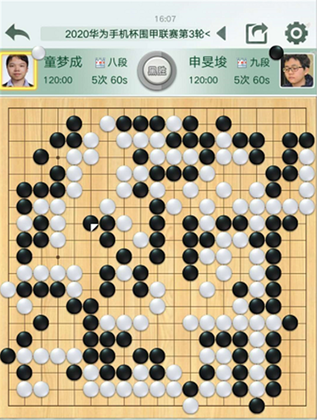 二臺(tái),主將申旻俊執(zhí)白對陣童夢成。局勢一直接近。白126、132連續(xù)走了小棋,黑開始領(lǐng)先。