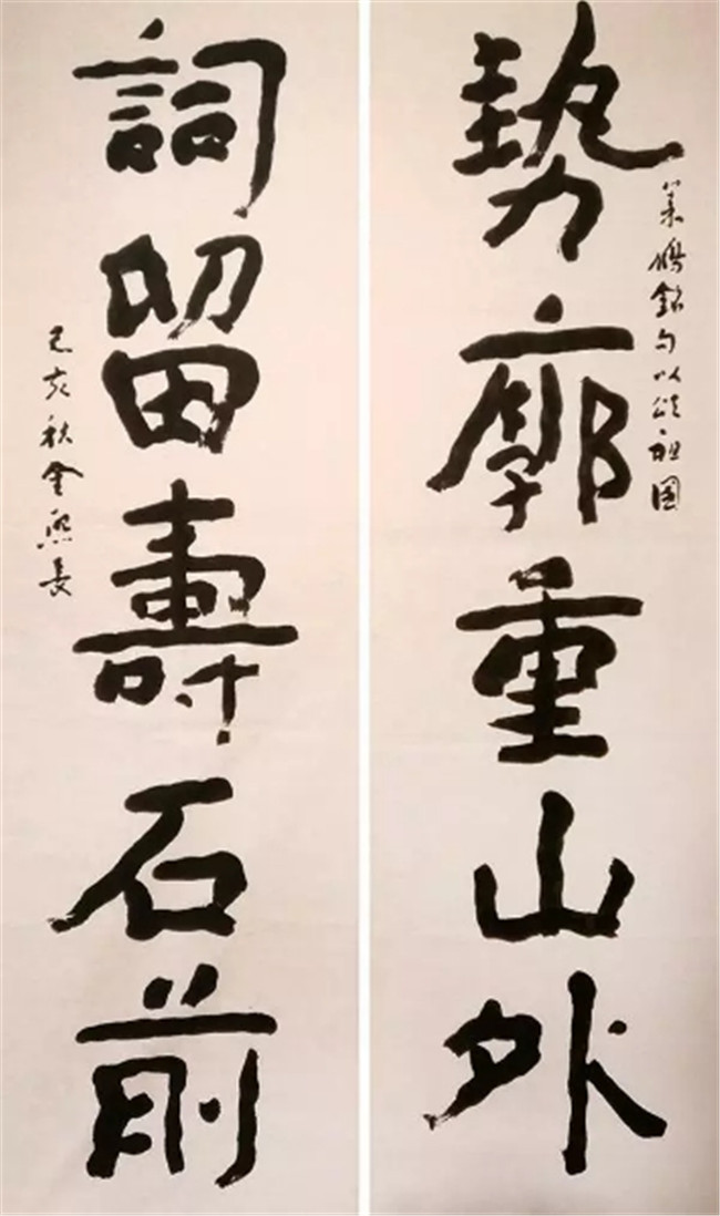 “筆筆有出處,字字有來歷。每個字用筆中鋒但結字奇古;書風野逸但又視覺大氣。正如創(chuàng)作者所言:中國是歷史悠久的文化大國,所以中國的文字書寫應該和大國文化相吻合的,以雄渾大氣為主要審美意識的表現(xiàn)手法方能展現(xiàn)中國精神。在技法上他還認為,秀媚易作雄渾難;小巧易作高簡難。故在本次《金體》創(chuàng)作上的審美觀念上,他仍以三個第一為導向,即“結體以正大老成為第一,用筆以簡重真切為第一,書風以高古偉岸為第一。