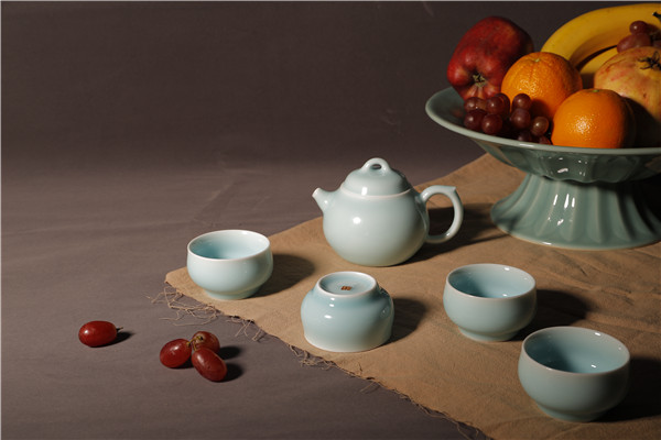 再就是印順大和尚倡意定制的帶有濃厚佛教色彩的生活用具,如紫砂、青瓷茶具套組《舍得》,景德鎮(zhèn)描金茶具“六度”系列《荷順》,均有以佛教意象蓮花為內(nèi)容的圖案或造型,讓人在使用時頓生清靜心、倍感佛法力,或可為信眾修行悟道助一臂之力。