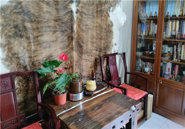 俗話說得好:見識(shí)一個(gè)素養(yǎng),看看他的書房就知道了!那么,寧起興老師的書房是什么樣的呢?第一印象:簡(jiǎn)潔、古樸、有趣味。一眼掃去,臨窗一張紅木桌,兩個(gè)裝得滿滿的老書柜,兩張烏黑發(fā)亮的南官帽椅,中間配有一張老舊的喝茶的原木桌,正上方的墻面掛著一整張大大的南美阿根廷牛皮。墻上橫掃,掛有“室靜書馨”的書法作品,一張古琴,一把薩克斯,幾份有關(guān)他篆刻宣傳的剪報(bào),還有星星點(diǎn)點(diǎn)的各類鈴鐺。細(xì)看呢:書柜里的篆刻工具書,有大部頭的字典、印譜和系列叢書,也有與篆刻相關(guān)的文化類書籍,大多插滿了顏色各異的標(biāo)簽,可見寧老師讀書的細(xì)致與用心。紅木大桌上有一對(duì)大音箱,是原裝進(jìn)口的德國(guó)貨;桌子旁,有一正方形的小桌特別顯眼,寧老師帶著些許自豪的神態(tài)介紹說,鉗臺(tái)是德國(guó)進(jìn)口的,鋸子也是原裝進(jìn)口的,那個(gè)刻銅印的印盤是定制的。還有,他所用的刻刀頂端印有l(wèi)ogo,是小篆“寧”字與工字的合寫,該刀鋼材鈷含量為17%,也是定制的。正所謂“工欲善其事,必先利其器”,寧老師深以為然。是以,他在工具上追求“高精尖”甚至不惜工本。