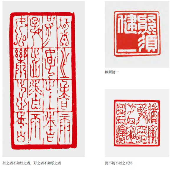 說起自己的代表作,寧老師十分謙虛,但筆者還從他的印屏、印作中,從以往宣傳報(bào)道中理出了一些頭緒。比如,剛來深圳,有感于鄧小平同志的功績(jī),刻了一方《總設(shè)計(jì)師鄧小平》,陳巨來的印味明顯。2013年寶安區(qū)書法協(xié)會(huì)發(fā)行新年掛歷上印有“蛇年大吉”印章,便出自他手。那是一方金文白文印,整體舒朗開闊,靈動(dòng)高古,爛漫天成,不失為其代表作。還有,用一方印完整地刻出了268字的《心經(jīng)》亦是獨(dú)一無(wú)二的。他為友所刻《真善美》朱文鳥蟲篆,布局疏密自然,光潔妍美,婀娜多姿,韻味無(wú)窮。元朱文白文印《熊須健一》,疏密呼應(yīng),“一”字處大片留紅,與另三字形成強(qiáng)烈對(duì)比,“須”字三撇作美化處理,形成印眼。此印工穩(wěn)爽朗,行刀如筆,耐人尋味。還有應(yīng)約為著名棋手武宮正樹、徐瑩等所刻鳥蟲篆印均“嵌入”圍棋黑白二子的元素,自然貼切,又妙趣橫生。還有為出版社、書局、書籍插圖以及賽事配刻的印章更是數(shù)不勝數(shù)。當(dāng)前,寧老師依然精神飽滿、創(chuàng)作旺盛,相信未來還會(huì)不斷有令人驚喜的印品佳作問世。