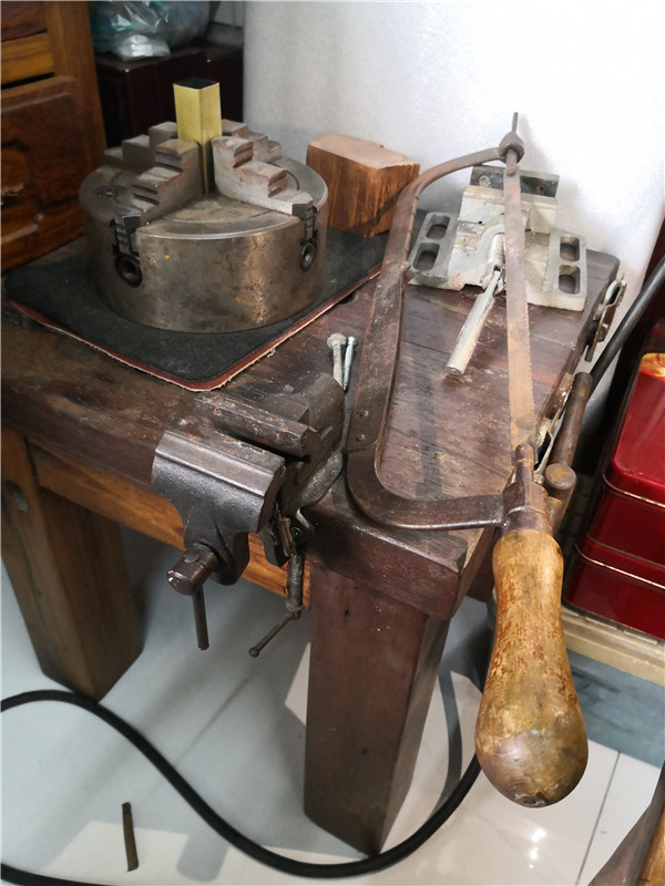船木工作臺(tái)擺的全是寧老師的心肝寶貝:進(jìn)口或定制的篆刻臺(tái)、鋸、刀等。