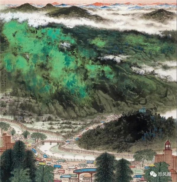 來自南京而定居于深圳的宋玉明,試圖將新金陵畫派表現(xiàn)現(xiàn)實的變革精神用于現(xiàn)代城市山水畫的探索上。作為新金陵畫派的第二代畫家,宋玉明直接承傳了宋文治表現(xiàn)現(xiàn)代太湖人居環(huán)境秀潤而精巧的家法,并將此種大山景加小民居的畫法轉(zhuǎn)用到深圳城市形態(tài)的表現(xiàn)上。這里,我們一方面可以看到深圳作為一個新興的現(xiàn)代城市借山而筑、注重自然環(huán)境在城市生態(tài)建設(shè)上的積極作用;另一方面,深圳這種與自然相統(tǒng)一的現(xiàn)代化城市建設(shè)理念,也為宋玉明進(jìn)行城市山水畫創(chuàng)作提供了完美的表現(xiàn)對象。在《深圳文錦渡》等作品里,我們看到了畫家巧妙地將城市現(xiàn)代建筑與自然山水融為一體的表現(xiàn)。這些畫作,大多以勾線渲染的方法表現(xiàn)遠(yuǎn)景中的商用或市政建筑設(shè)施,也因這些建筑被設(shè)置在中遠(yuǎn)景,不僅減少了建筑塑造的困窘,而且突出了這些人居建筑與自然相得益彰的和諧關(guān)系。這些畫作,從嚴(yán)格的意義上說,仍然是山水畫,而宋式小散鋒皴以及云煙雨霧的渲染,也為畫面增添了幽深、恬靜、高雅、平和的意趣與境界。這些畫作,讓我們所熟悉的城市從一個相對遙遠(yuǎn)的視角來觀看,既因距離產(chǎn)生了一種從未體驗過的美感,也較好地體現(xiàn)了現(xiàn)代城市與自然占位的協(xié)調(diào)統(tǒng)一、舒適宜居的比例關(guān)系。