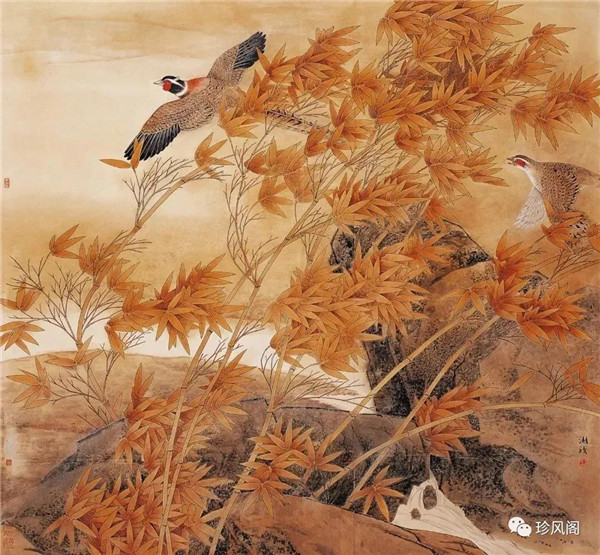 在構(gòu)圖上,他往往打破傳統(tǒng)工筆花鳥畫中的一些常見程式,講究“起承轉(zhuǎn)合”“賓主揖讓”與“呼應(yīng)關(guān)系”,強調(diào)構(gòu)圖布勢的“自然天成”;在勾勒上,注重墨分五色,焦、濃、重、淡、清,用筆的墨色根據(jù)不同對象、不同結(jié)構(gòu)而進(jìn)行變化,筆法的起落、轉(zhuǎn)折、頓挫都與表現(xiàn)的形象、性質(zhì)有極密切的關(guān)系;在用色上,他一改當(dāng)代一部分花鳥畫流于程式、設(shè)色濃艷匠氣的弊端,而是集合多種畫法,在傳統(tǒng)固有色中融入西洋畫法的色彩規(guī)律,追求整體色調(diào)的對比與協(xié)調(diào),所以其作品體現(xiàn)出不同于傳統(tǒng)工筆花鳥畫的意境和氛圍。