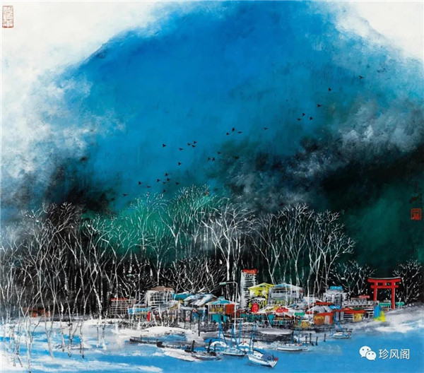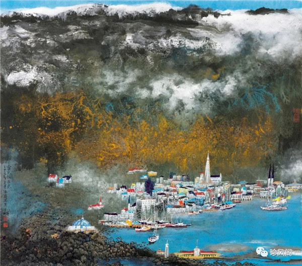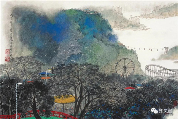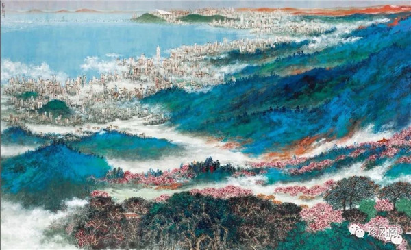 宋玉明從金陵畫派的新傳統(tǒng)跨越到城市表現(xiàn)的積彩拓墨畫法,既體現(xiàn)了現(xiàn)代化城市對于變革傳統(tǒng)的時代訴求,也體現(xiàn)了他移居深圳后這座新興城市文化對于他的深刻影響。畢竟,連續(xù)數(shù)屆的深圳水墨雙年展對于水墨在跨文化中重要作用與表現(xiàn)方法的突破,都給予他至深的思想開拓。這表明,城市山水畫已不單純是用中國畫表現(xiàn)城市的命題,而是其中能夠蘊含多少城市文化觀念與城市審美的方法,宋玉明對于城市山水畫的探索,體現(xiàn)的正是這樣一種對城市現(xiàn)代文化的思想融合性。而不拘謹(jǐn)于城市一磚一石、一街一道、一房一樓的描繪,著眼于發(fā)揮水墨與彩墨表現(xiàn)的自由性,抑或體現(xiàn)了人性、自然與現(xiàn)代城市共同作用的現(xiàn)代生活方式與人文理想。的確,純粹用中國畫或水墨畫來探索城市的現(xiàn)代化景觀表現(xiàn),也許只是淺層次的審美需求;而只有當(dāng)把山水畫作為人與自然和諧統(tǒng)一的觀念表達(dá)植入城市現(xiàn)代化的審美訴求時,城市山水畫才能真正凸顯出其深刻的美學(xué)價值。這正是我們從宋玉明的作品里能夠讀解到的他對于城市山水畫審美理想的一種勾畫。