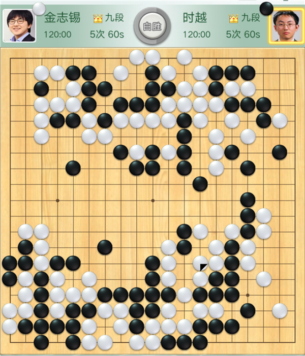 緊接著,時越執(zhí)黑對陣金志錫一局傳來告負(fù)的消息。縱觀全局,開局時黑稍好,但中盤攻擊上邊白棋時候方向錯誤,被白棋聯(lián)絡(luò)后自身還留下了白棋開劫的隱患。之后黑棋在劫爭中放棄上方黑子在下邊圍出大模樣爭勝。白棋在黑勢中施展手段時黑棋必需尋求凈殺白子。無奈周邊不夠厚實殺不掉,遂于174手時認(rèn)負(fù)。
