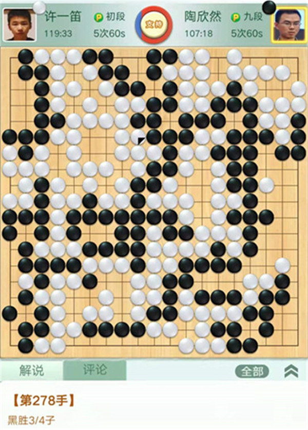 陶欣然執(zhí)黑對陣新初段許一笛。開局下邊黑棋稍虧,之后在左下角獲得便宜黑棋領先。大官子黑棋有所失誤局勢又是白好。之后小官子時候白棋又有失誤,黑棋幸運的3/4子獲勝。