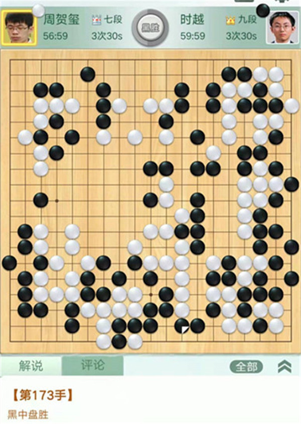 時越快棋執(zhí)黑對陣周賀璽。中盤黑棋在右邊沖擊白棋時候,白棋沒有下出一路立的妙手,而是選擇了做劫,劫爭轉換后黑棋全吃右邊大棋,已成勝勢。之后黑棋又在下邊白空出棋再活出一塊,中盤獲勝。