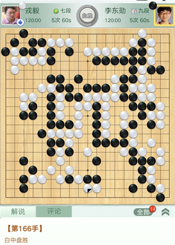 龍華隊戎毅七段本輪重新披掛上陣,執(zhí)白對陣韓國排名第四的李東勛。開局二十幾手時,黑在左上出現(xiàn)重大失誤,白棋大幅領先。之后,白思路清晰,掌控局面,優(yōu)勢逐漸擴大,而速勝。