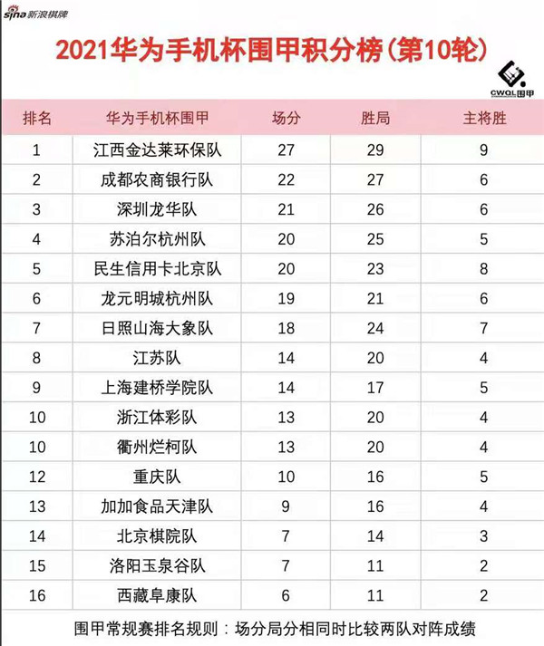 讀特客戶端?深圳新聞網(wǎng)2021年6月12日訊(記者周錦春)華為手機杯男子圍甲聯(lián)賽第二階最后一輪比賽今日塵埃落定,16圍甲隊伍可以暫時偃旗息鼓,安安心心地享受端午節(jié)的快樂時光了。第十輪深圳龍華隊對陣龍元明城杭州隊,以1:3再次敗退一步,從積分榜第二的位置降至第三,江西隊金達萊環(huán)保隊、成都農(nóng)商銀行隊分居狀元、榜眼之位。圍甲第三階段比賽預計在8月底繼續(xù)在浙江長興進行。