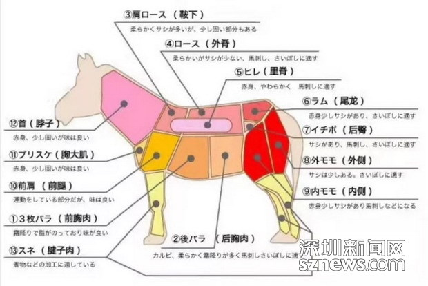 馬能做成刺身的部位相當(dāng)?shù)挠邢?,依照油花分布大致可以分為腹?卜口)、霜降、赤身等不同的等級(jí)。其中最稀有的的“三枚腹”肉,一匹五百公斤的馬只能產(chǎn)出大約5-6公斤,肉質(zhì)口感近似于藍(lán)鰭金槍魚(yú)中腹肉。