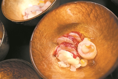 頭盤 “荷塘魚趣”,主角黃花魚來自世界第三大江——長江。步步生蓮是東方禪意,蓮子依依是情誼,蓮藕結(jié)結(jié)是路路通達(dá),Alvin Leung此次演繹的中式料理充滿東方元素,表達(dá)的是和諧交融。主菜“日式鮮味香烤和牛”是日本主廚Hisamitsu Hataji 之作,他用創(chuàng)新手法融入經(jīng)典的日式料理中,表達(dá)一年四季食材與味道的關(guān)系,這是關(guān)于美食的光陰的故事。甜品出自Clement之手,是晚宴甜蜜的句號(hào)。