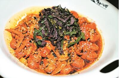 廚師用了特別從湖南長沙選來的紫蘇,在碗底鋪上一層,再將炒制過的小龍蝦放上,最后于蝦面上多撒一層紫蘇,吃時拌起,紫蘇的香氣充分融入蝦身,風(fēng)味獨(dú)特。