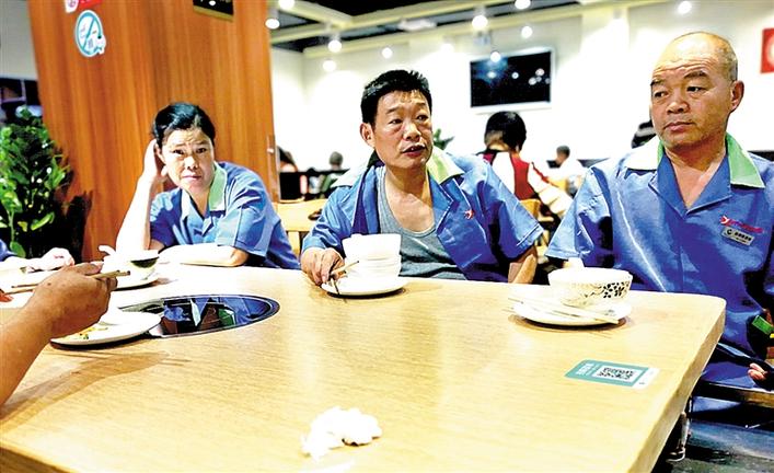 在店里吃飯的人群里,有一張臺(tái)全是清一色的藍(lán)色工作服,特別顯眼?!拔覀兠刻於紩?huì)來(lái)這里吃早餐,差不多有一年時(shí)間了,這里的老板太好了,希望他能一直開下去?!边@幾個(gè)大叔、大嬸是周邊物業(yè)的清潔工人,他們每天早上5點(diǎn)鐘就上崗工作,忙完就到了6-7點(diǎn),又餓又累,有一碗熱騰騰的早餐是一件非常幸福的事,而這種開心快樂的事情在這里發(fā)生了。吳姓清潔工說(shuō),這里的老板和員工很好,大家來(lái)這里吃粥,沒有感到半點(diǎn)不自在,就像在自己家一樣。