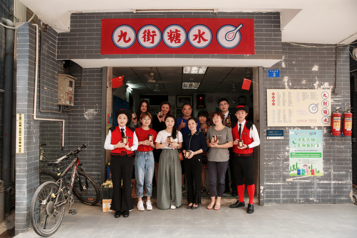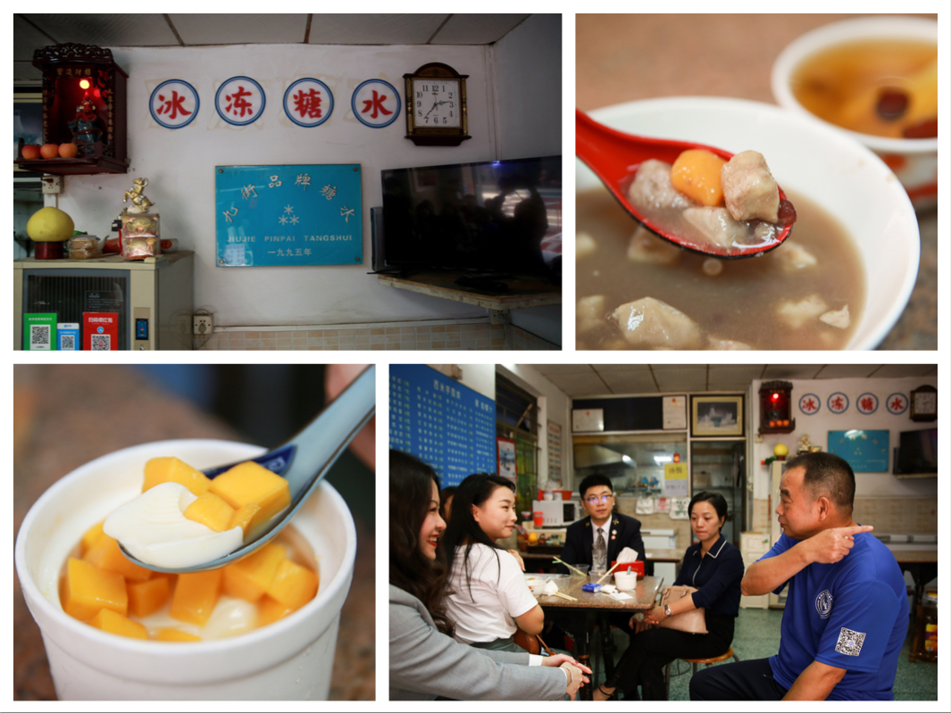 在禮賓司的引領(lǐng)下,大家來到已有千年歷史的文化遺產(chǎn)——南頭古城。一行人在“九街糖水鋪”入座,店主夫妻倆熱情的端出清甜可口的化州糖水和香氣四溢的潮州炒米粉,和我們嘮起了家長(zhǎng)里短。大家方才得知,這宛如尋常百姓家的糖水鋪竟開業(yè)于1995年,見證了古城九街的變遷翻新和故去新來的幾代人潮川流。帶著傳播化州糖水美名初衷的糖水世家選擇在深圳發(fā)家,傳到這已是第三代。眾人大快朵頤,禮賓司也幫忙跑堂添茶。