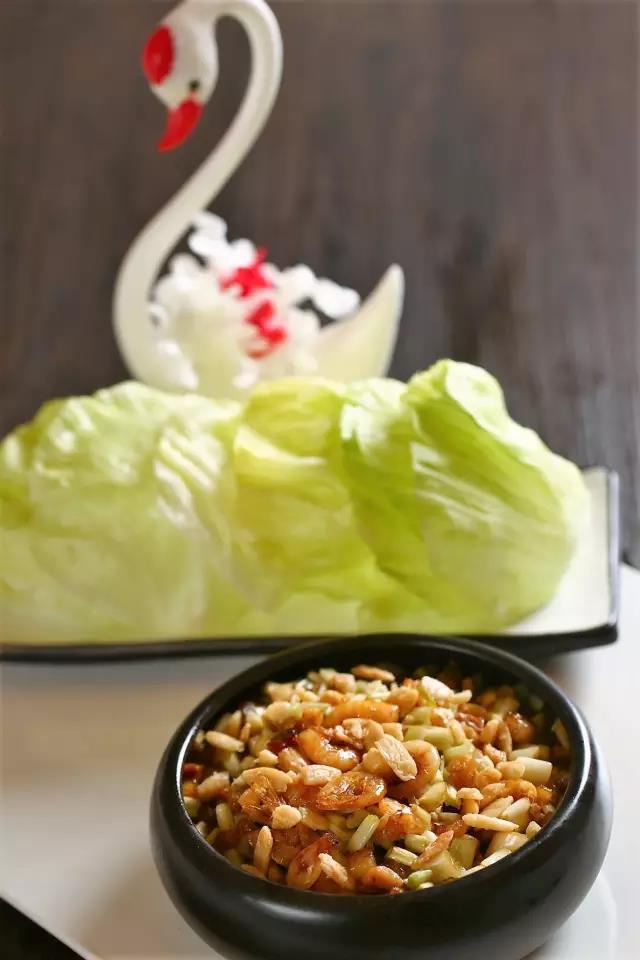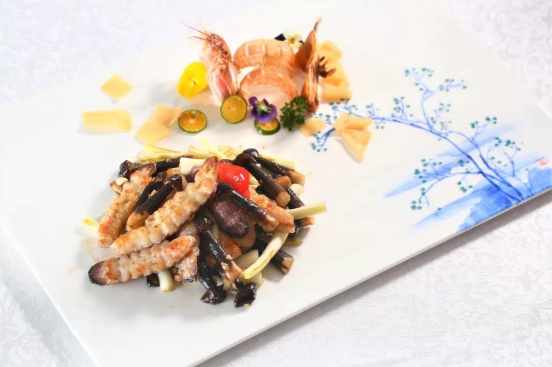 皮皮蝦焯熟以后過冰,剪去邊緣的刺,再完整拆出肉來,拍上少許味料與生粉,煎到兩面呈金黃色。然后加入蕎菜翻炒片刻即可。除了這二者之外,還會(huì)配爽口的黑雞樅。
