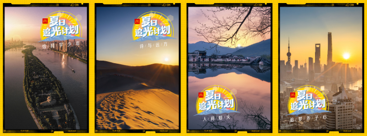 7月6日,麥當(dāng)勞“夏日追光計(jì)劃”從西安大雁塔出發(fā),來到長(zhǎng)沙橘子洲頭,領(lǐng)略“恰同學(xué)少年”的意氣風(fēng)發(fā)。從敦煌、漠河,到青海湖和張掖,一起尋找“詩與遠(yuǎn)方”。跨越青島、杭州、福州、大連、蘇州和平遙,看遍“人間煙火”。在廣州小蠻腰和深圳東門,感受“追夢(mèng)赤子心”。為期28天的追光之旅,暖心浪漫的麥當(dāng)勞為大家搜集不同城市的日出,并用四個(gè)主題串起28地。敬請(qǐng)關(guān)注麥當(dāng)勞嗶哩嗶哩(B站)帳號(hào),鎖定連續(xù)28天的直播,也可以訪問麥當(dāng)勞官方網(wǎng)站觀看每天日出的精華視頻。