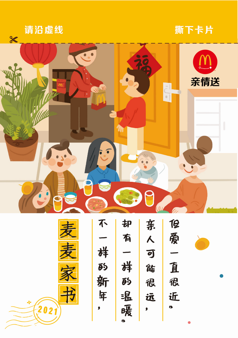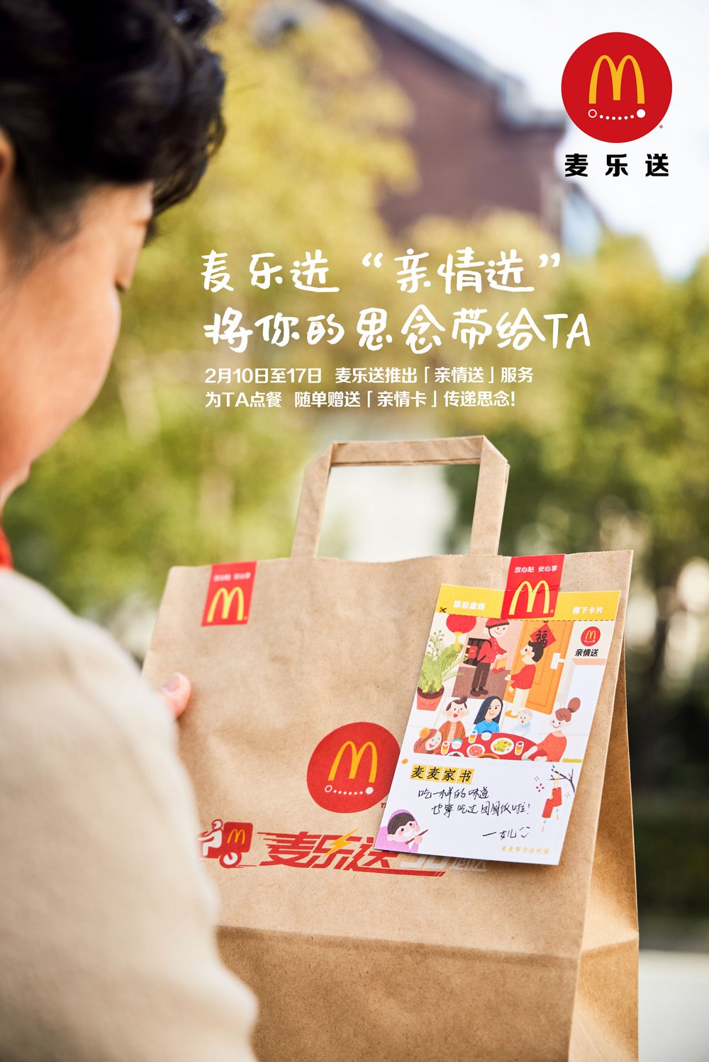 為了讓分隔兩地的顧客表達(dá)對彼此的思念和祝福,麥樂送于春節(jié)期間推出“親情送”服務(wù)。2月10日至2月17日,在i麥樂送小程序、麥當(dāng)勞App、美團(tuán)麥當(dāng)勞店鋪、餓了么麥當(dāng)勞店鋪,顧客可以選擇“親情送”服務(wù),為遠(yuǎn)在異地的親人朋友點餐,麥樂送會在訂單中附上【親情卡】,消費(fèi)者可以定制祝福,卡片連同美食將一齊送達(dá)你思念的人手中。