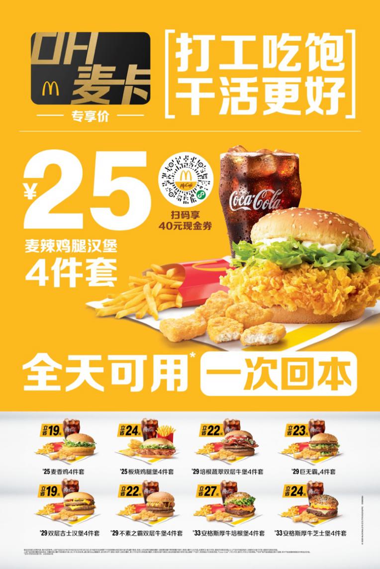 調(diào)研還顯示,超過四成的消費(fèi)者表示希望在餐飲上節(jié)約至少10%的支出,而麥當(dāng)勞的“打工人保底計(jì)劃”提供了多種大力度的優(yōu)惠。以午餐為例,消費(fèi)者若購(gòu)買OH麥卡,享用超值四件套即可至少節(jié)省19元,即減少39%的開支。
