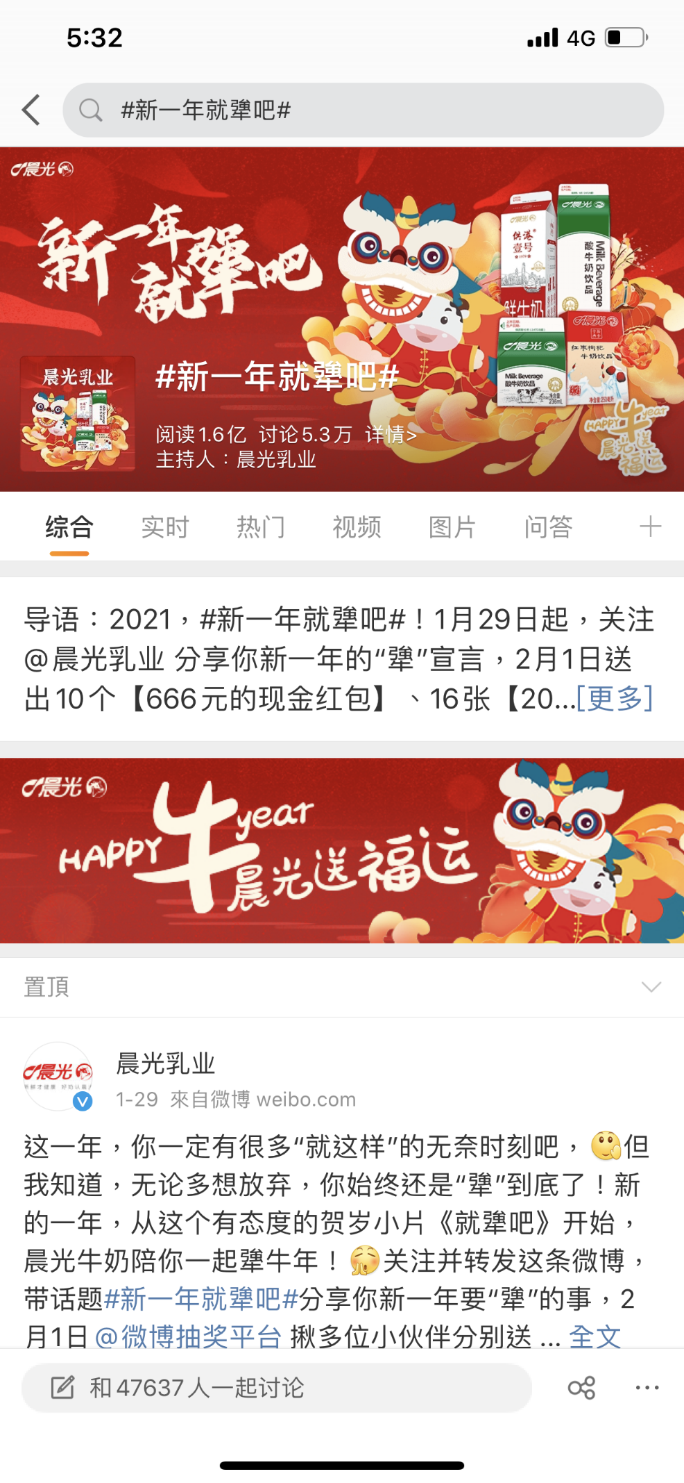 與此同時,@晨光牛奶發(fā)起“犟到底”話題分享抽獎活動,以“666元紅包”等“牛氣”獎品刺激用戶參與話題討論。最終,話題 #新一年就犟吧#登陸微博熱搜榜第6位,僅兩日吸引1.5萬人參與討論,話題閱讀量突破1.6億。