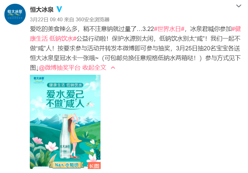 見圳客戶端·深圳新聞網(wǎng)2021年3月30日訊 (記者 常軍平)目前正值3月22日第二十九屆“世界水日”以及3月22—28日第三十四屆“中國水周”之際,恒大冰泉天然低鈉礦泉水深入洞察借勢,發(fā)起以不做“咸”人為主題的公益活動,引發(fā)了全網(wǎng)的關注熱議和積極參與,刷屏社交媒體,成為新的公益“爆款”。