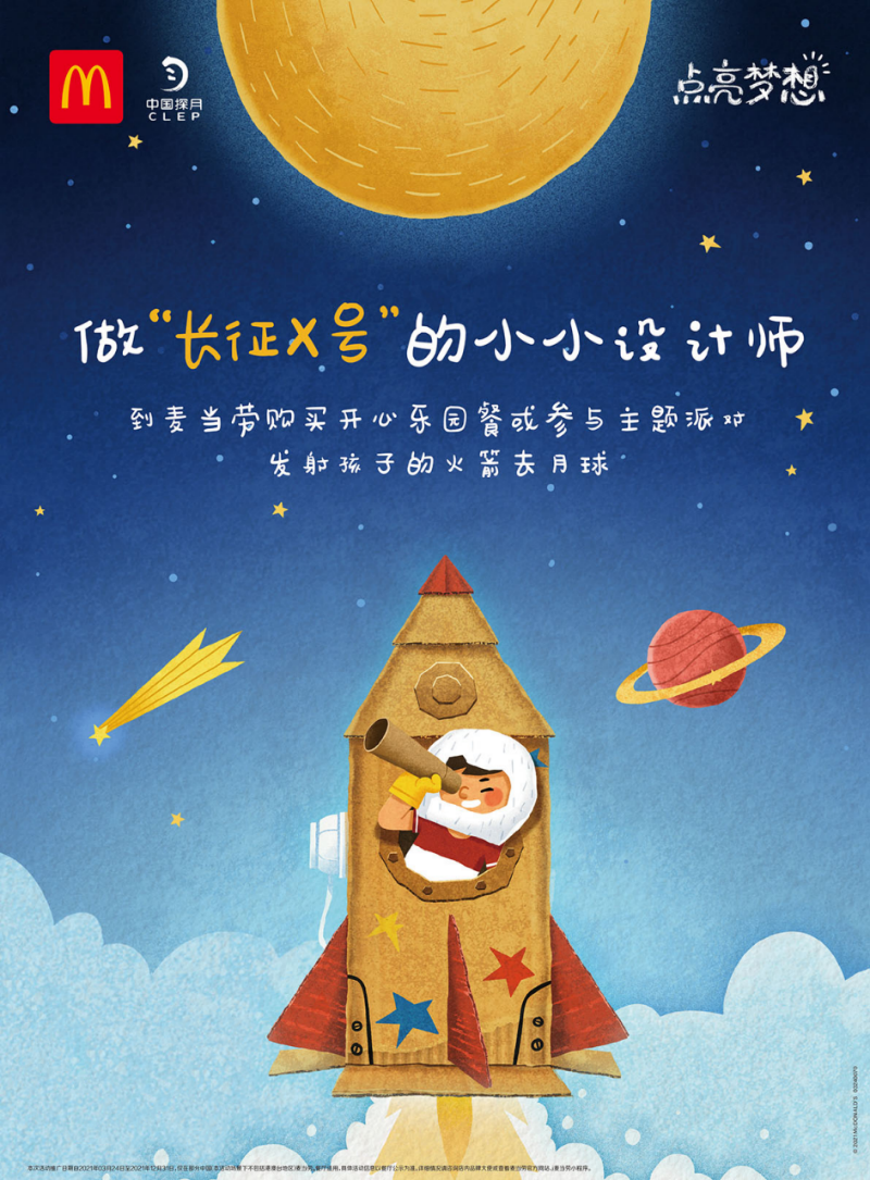 2021點(diǎn)亮夢(mèng)想活動(dòng),是麥當(dāng)勞與中國(guó)探月的二度合作,雙方再次聯(lián)合守護(hù)夢(mèng)想,并鼓勵(lì)動(dòng)手實(shí)踐,做到“敢夢(mèng)敢想敢為”。