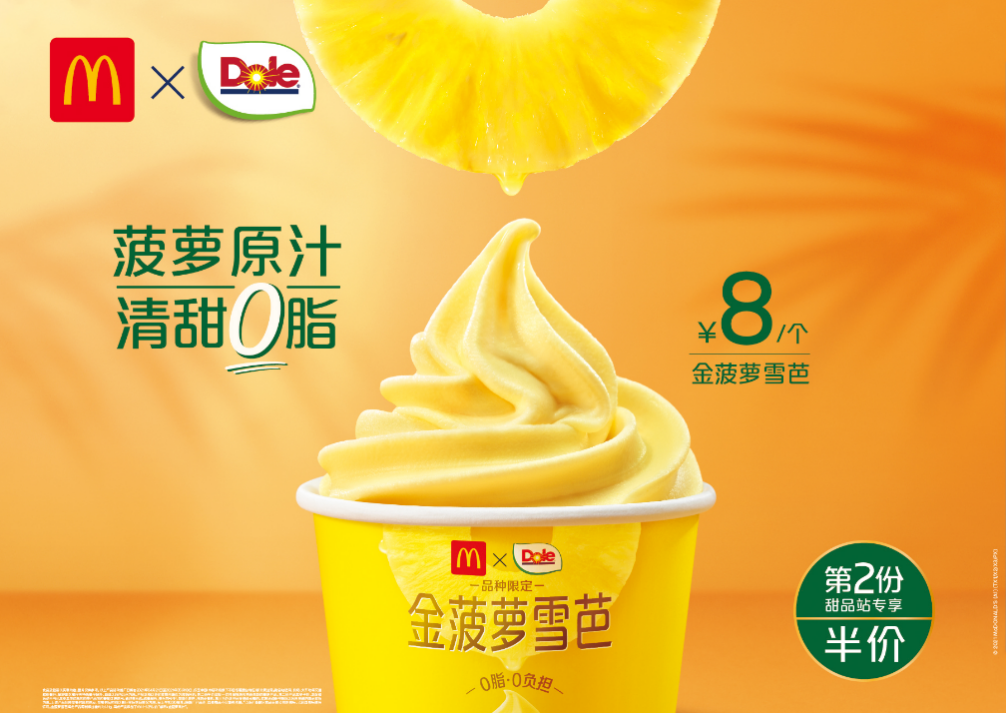 金菠蘿雪芭是麥當(dāng)勞中國(guó)的首個(gè)雪芭類產(chǎn)品,使用都樂(lè)原榨金菠蘿汁,清甜爽口,濃濃果香無(wú)負(fù)擔(dān)。選用的都樂(lè)金菠蘿產(chǎn)自菲律賓棉蘭老島,口感細(xì)膩甘甜,果肉金黃多汁。金菠蘿雪芭不含牛奶或奶油成分,脂肪含量為零。該產(chǎn)品已2021年4月21日在麥當(dāng)勞中國(guó)28個(gè)城市的2000多個(gè)甜品站售賣,限時(shí)售價(jià)8元,享受第二個(gè)半價(jià)優(yōu)惠。