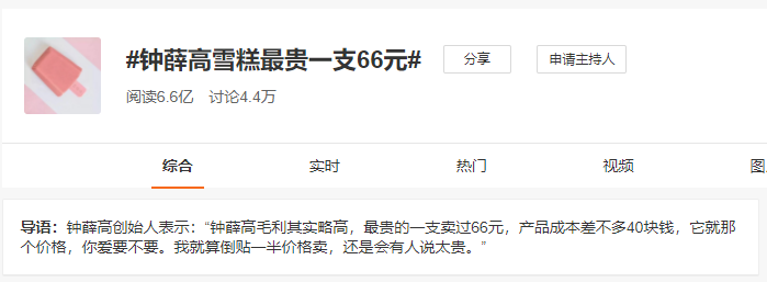 鐘薛高誕生于2018年3月,在當(dāng)年“雙11”就已成為天貓冰品類銷售第一,其被粉絲稱為“雪糕界的愛馬仕”,有人是鐘薛高的忠實粉絲,也有很多人吐槽其價格太過于昂貴。