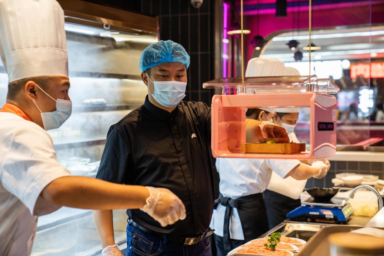 值得一提的是,除了地道的火鍋美食,這家餐廳的特別之處,在于高科技智能機(jī)器人的廣泛應(yīng)用。在餐廳過道里,一款名為“蠶豆”的配送機(jī)器人來回奔忙,把各式菜品有條不紊地送達(dá)顧客桌前。半空中,高效穿梭的云軌小車將菜品傳送到餐桌,“從天而降”呈現(xiàn)在顧客面前,科技體驗(yàn)感十足。這款“天降”智能云軌傳輸系統(tǒng),由智能配餐、智能云軌兩大模塊構(gòu)成。顧客通過手機(jī)下單后,智能配餐系統(tǒng)接到指令,能自動將相應(yīng)菜品餐食分配給云軌小車,高效、快速地配送到對應(yīng)餐桌,整個送餐過程實(shí)現(xiàn)“零接觸”,在高效率的同時(shí),確保了安全衛(wèi)生。