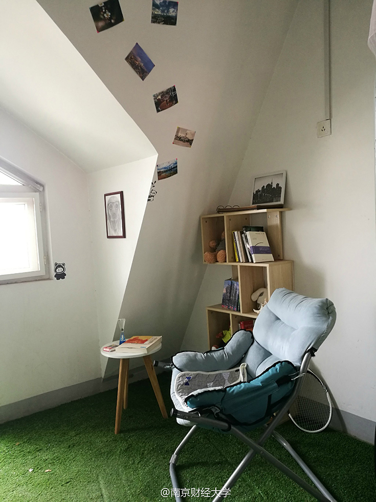 綿綿的草坪、充滿設計感的書架、掛著素描畫的墻……難以想象這是四個19歲男生的寢室。南京財經大學西苑9幢男生宿舍頂樓602寢室,住著4位“世外高人”—— 涂貴平、柯毅、劉以康和廉鎮(zhèn)宇,他們用事實告訴大家,男生宿舍文藝起來,可絲毫不輸女生。圖/@南京財經大學