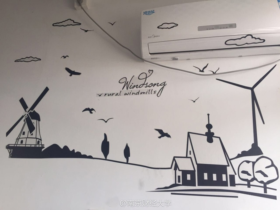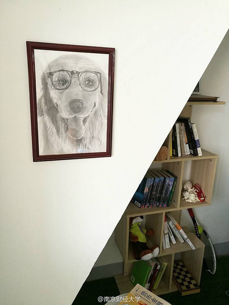 墻上一幅戴著眼鏡的小狗素描圖格外引人注目,它是由602舍長涂貴平親手畫的?!斑@幅畫還是去年自己參加了一個帶有公益性質的畫畫班學的,我也沒想到能畫成這樣。”來自貴州的涂貴平害羞地說,其實裝飾寢室的初衷很簡單,錢就花了300塊不到,主要是希望大學四年能住在干凈的環(huán)境。
