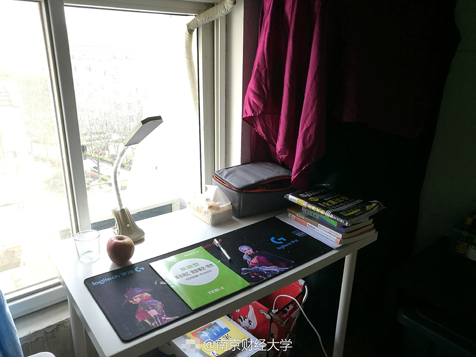 踏進宿舍大廳,地上碧綠的草坪讓人瞬間卸下疲乏,“這草坪是我秒殺的,花了150塊錢左右?!眮碜蕴K州的柯毅笑著說,是自己最先提議讓宿舍“換裝”的,原因很簡單:上大學了,應該有屬于自己的小環(huán)境。除了草坪,602寢室還添置了書桌、躺椅、三腳桌……柯毅介紹道,“我最喜歡這個白色的三角桌,有北歐簡潔風,當時花了好久時間在網上找這類桌子,最后選了這個,50多元,性價比最高。