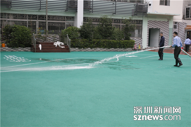 羅湖螺嶺外國(guó)語(yǔ)實(shí)驗(yàn)學(xué)校二部通過(guò)沖水的方式,清除跑道的異味