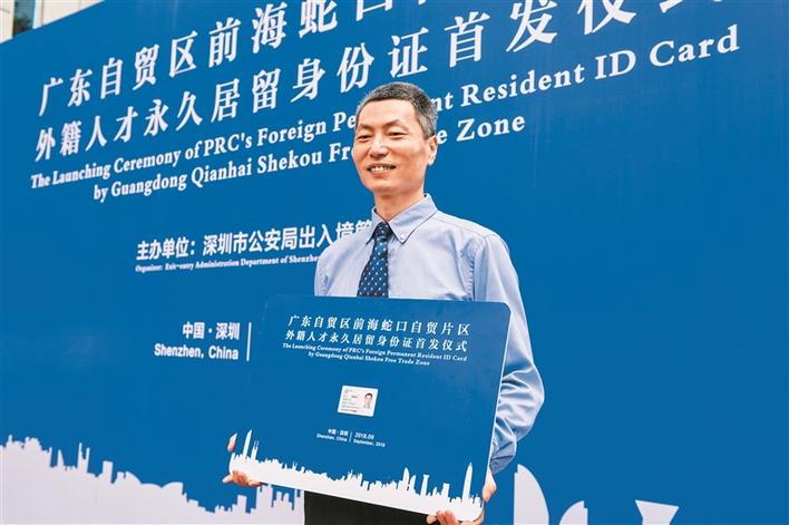 首發(fā)儀式上,深圳市副市長、公安局局長徐文海為首位獲得外籍人才永久居留身份證的張威發(fā)放了證件。今年47歲的張威是深圳順豐泰森控股(集團)有限公司的審計監(jiān)察高級經理。張威表示,這張外籍人才永久居留身份證不僅給他帶來諸多便利,更讓他有親切感和歸屬感。