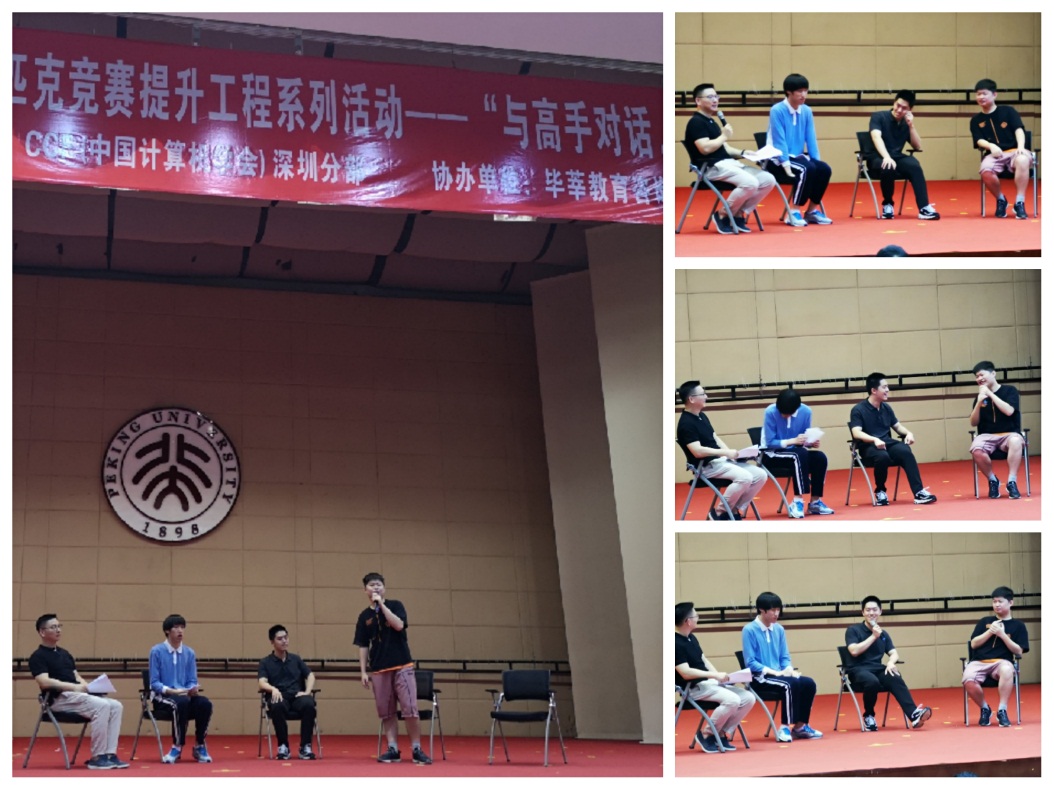 本次活動除了邀請周楷文同學親臨現(xiàn)場之外,還邀請了雅禮中學正高級教師,為雅禮貢獻了9塊IOI金牌的朱全民老師;北京大學深圳研究生院計算機專業(yè)雷凱副教授;雅禮中學畢業(yè),通過信息學競賽保送到北京大學信息科學與技術學院計算機專業(yè)就讀本科以及研究生的章嘉晨同學,國際大學生信息學競賽(ICPC)區(qū)域賽金獎、報送北京大學深圳研究生院就讀計算機專業(yè)的陳銳彪同學。