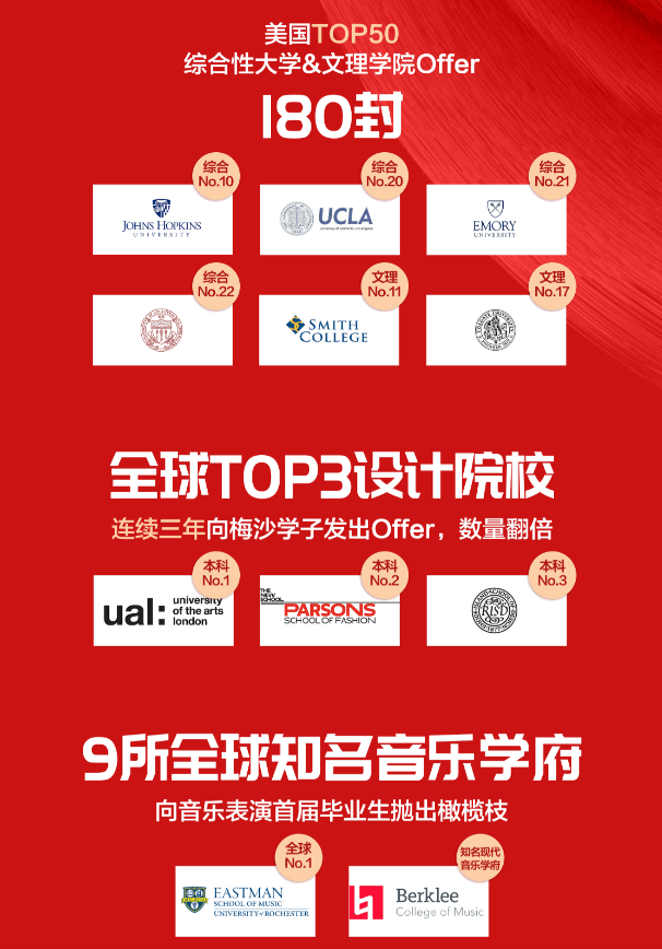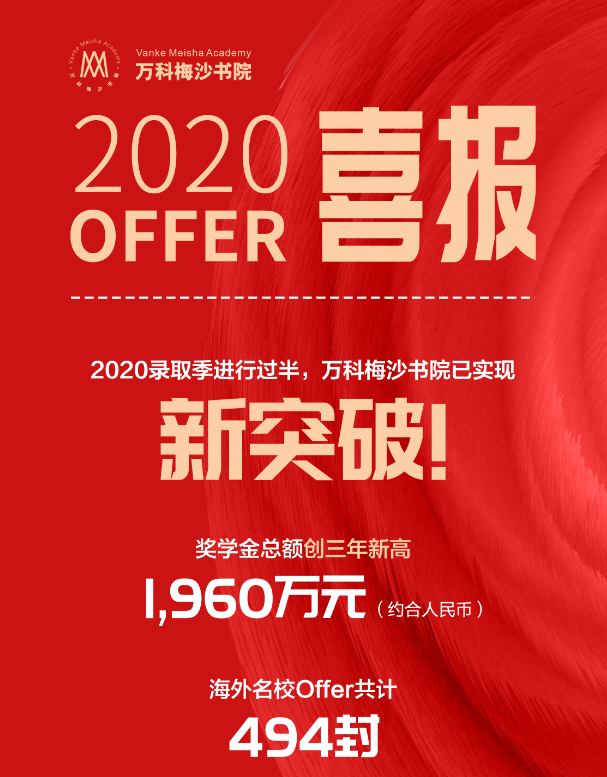 2020申請季還未結(jié)束,梅沙學(xué)子已收獲494封海外名校錄取Offer,獎學(xué)金累計(jì)約合人民幣1,960萬元,創(chuàng)三年新高。其中,來自美國Top100綜合性大學(xué)及文理學(xué)院的錄取通知書有356份,來自美國Top50綜合性大學(xué)及文理學(xué)院的錄取通知書有180份。