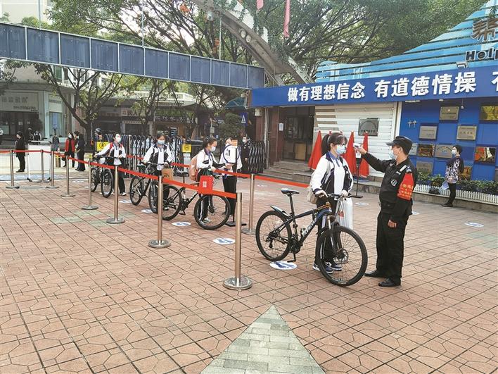 龍城初級(jí)中學(xué)學(xué)生騎自行車(chē)返校進(jìn)校門(mén)走專(zhuān)門(mén)的通道。晶報(bào)記者陳利城/攝