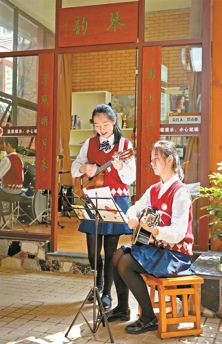 校園一角的“樂·舞臺”上擺放著一架鋼琴,陳鐵成校長說:“在沒有疫情的時候,這架鋼琴是不上鎖的,任何老師或學生都可以彈奏。同樣開放的還有琴韻閣、清心閣,不要擔心學生會破壞這些東西,美自然地呈現(xiàn)在學生們面前,自然地發(fā)生,真正的教育就是在這樣的情境中發(fā)生的?!?/p>