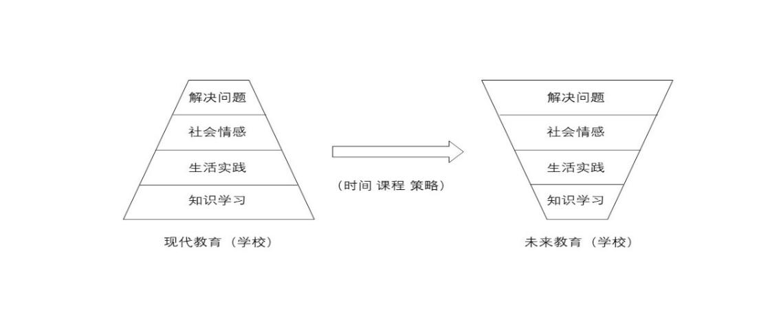 如果說未來教育要超越現(xiàn)代教育,必須把四個層次的權(quán)重倒置過來,如圖所示,即從時間、課程和策略上做根本性的認(rèn)識和改變。