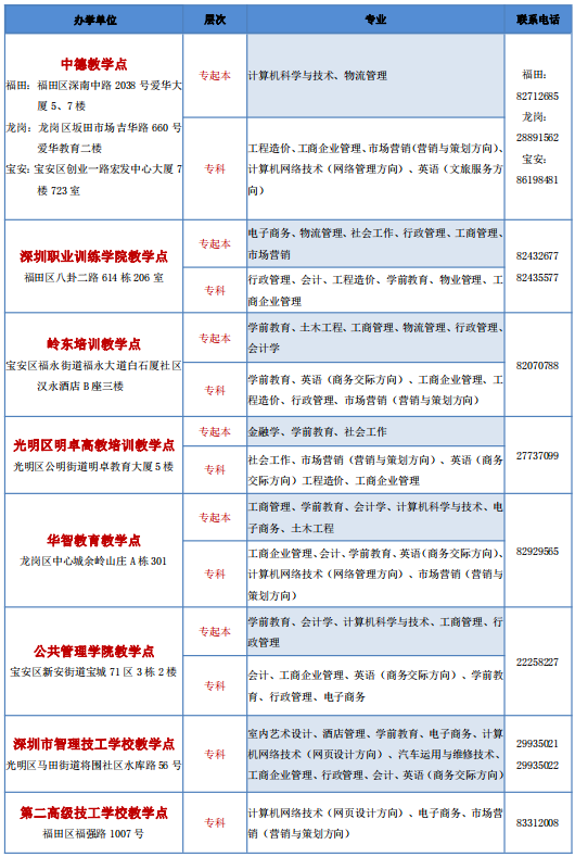 深圳開放大學(xué)2021年春季招生教學(xué)點(diǎn)與專業(yè)公示