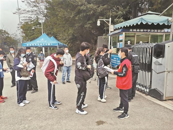 龍高黨員志愿者考前在校門(mén)口檢測(cè)學(xué)生體溫。