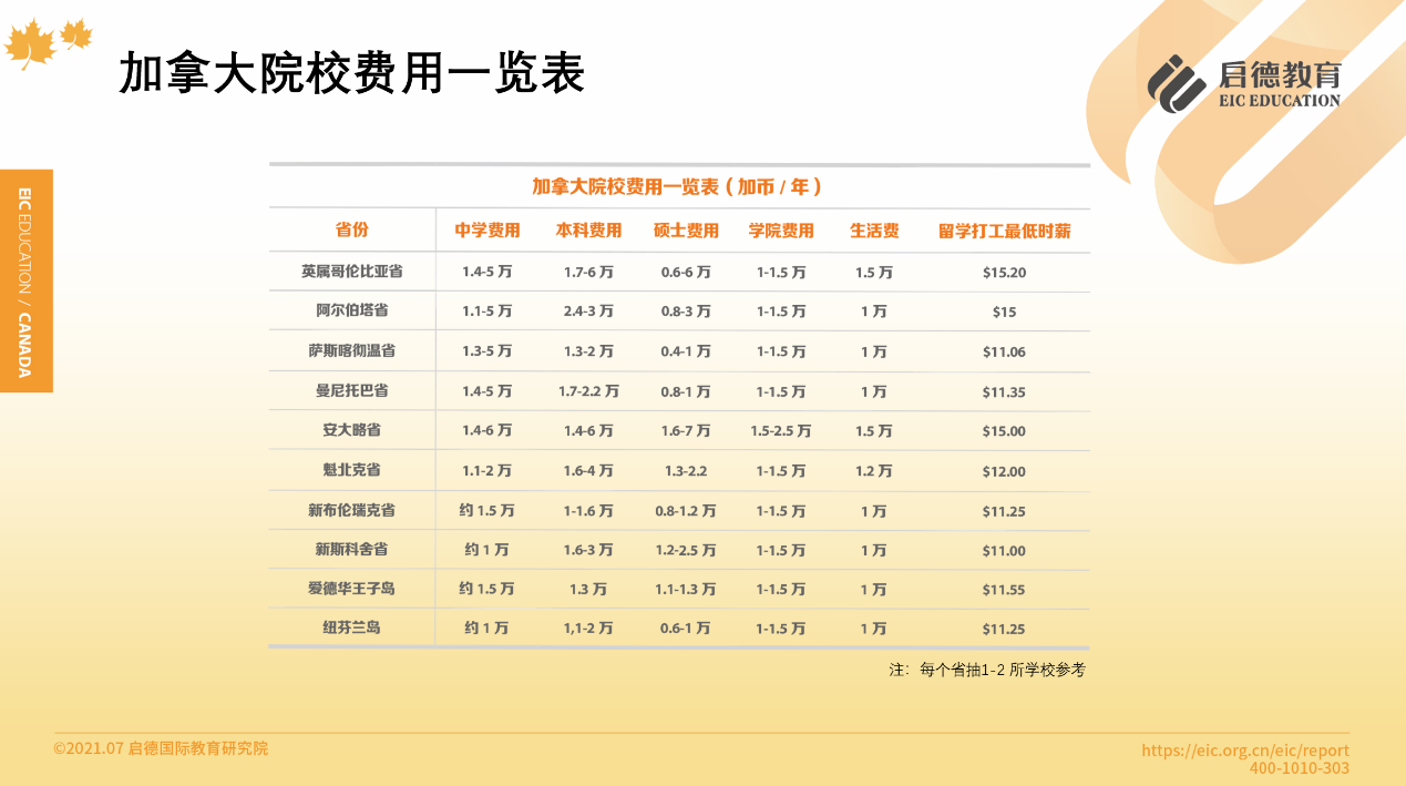 加拿大統(tǒng)計局?jǐn)?shù)據(jù)顯示,2019-2020學(xué)年加拿大國際留學(xué)生,本科平均學(xué)費為29714加幣 /年 (同比上學(xué)年增漲7.6% ),約合16萬人民幣/年;碩士平均學(xué)費水平為17744加幣 /年(同比上學(xué)年增漲4% ),約合10萬人民幣/年;生活費1萬 -1.5萬加幣 /年,約合5.2萬-7.9萬人民幣/年,總留學(xué)費用在美、英、澳、加四大熱門留學(xué)目的國中最低。此外,加拿大公立中學(xué)學(xué)費、生活費用共約14萬人民幣 /年,國際私立中學(xué)共約20萬人民幣 /年,私立本地精英中學(xué)共約20萬-28萬人民幣/年,私立貴族中學(xué)共約26萬 -40萬人民幣 /年。
