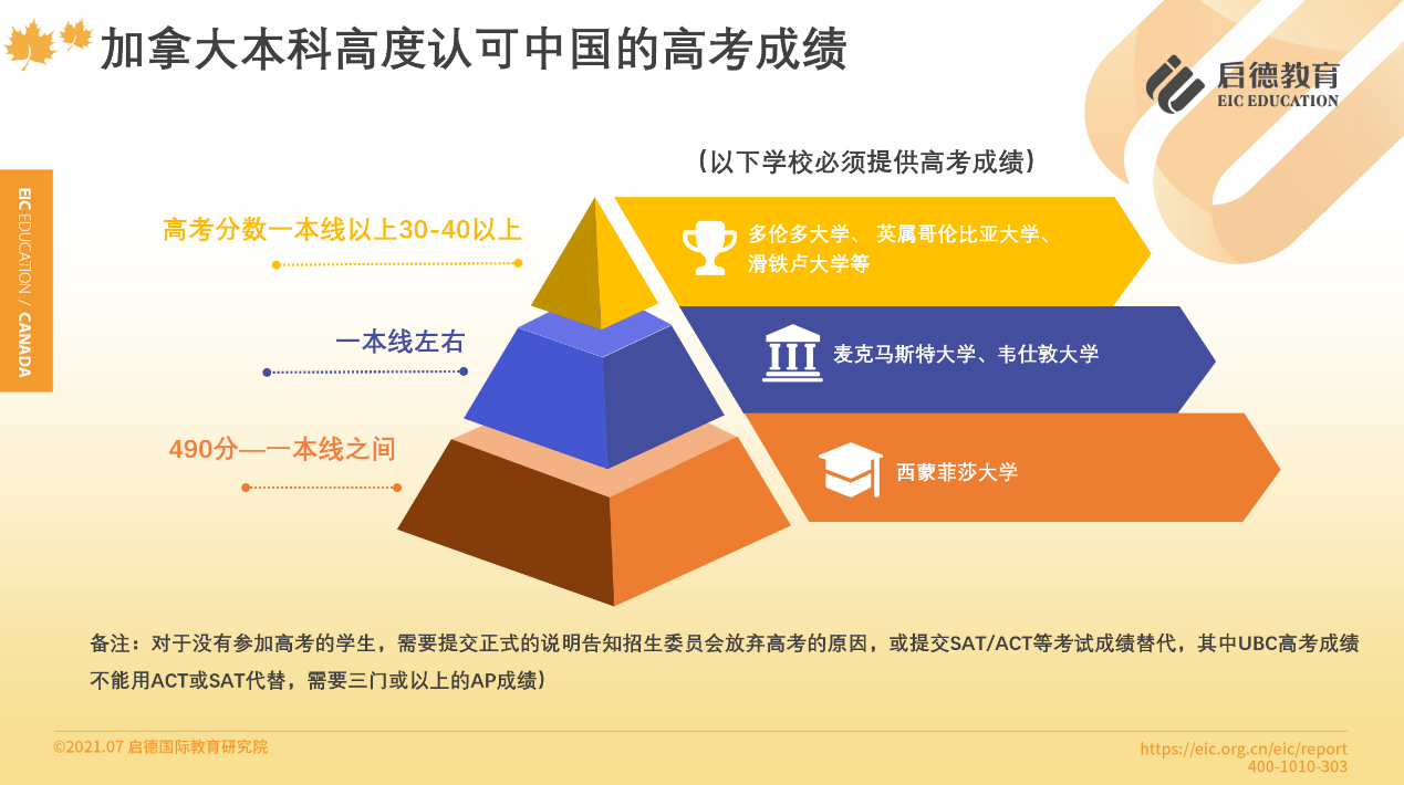 加拿大本科認(rèn)可中國的高考成績,其中多倫多大學(xué)、英屬哥倫比亞大學(xué)、滑鐵盧大學(xué)等要求高考分?jǐn)?shù)一本線30-40分以上,麥克馬斯特大學(xué)、韋仕敦大學(xué)要求一本線左右,西蒙菲莎大學(xué)要求490分至一本線之間。沒有參加高考的學(xué)生,需要提交正式的說明告知招生委員會放棄高考的原因,或提交SAT/ACT等考試成績替代(其中英屬哥倫比亞大學(xué)高考成績不能用ACT或SAT代替,需要三門或以上的AP成績)。