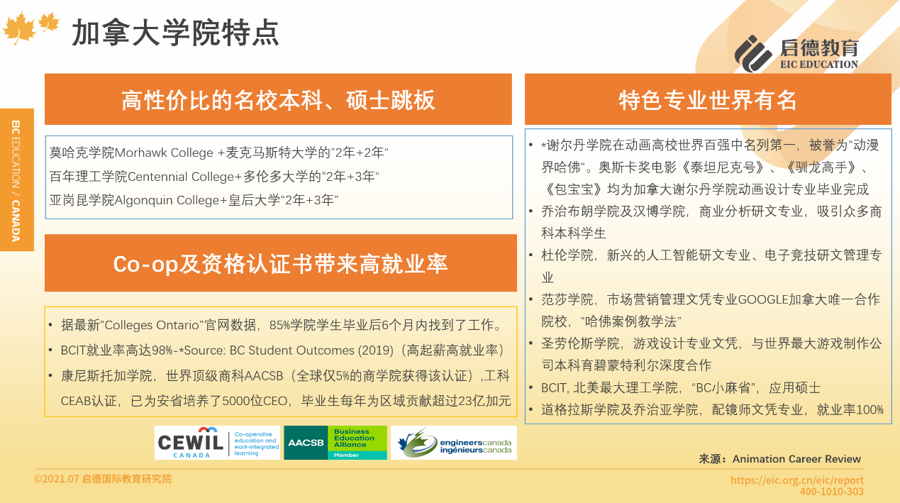 “ Colleges Ontario”官網(wǎng)數(shù)據(jù)顯示,85 %的學(xué)院學(xué)生畢業(yè)后6個月內(nèi)找到了工作,91%的雇主對學(xué)生表示非常滿意。如康尼斯托加學(xué)院,擁有世界頂級商科 AACSB與工科 CEAB認(rèn)證,為安省培養(yǎng)了5000位 CEO,畢業(yè)生每年為區(qū)域貢獻超過23億加元。而奧斯卡獎電影《泰坦尼克號》、《馴龍高手》、《包寶寶》均為加拿大謝爾丹學(xué)院動畫設(shè)計專業(yè)畢業(yè)完成。杜倫學(xué)院的人工智能專業(yè),道格拉斯學(xué)院的配鏡師專業(yè)也是世界有名的特色專業(yè)。