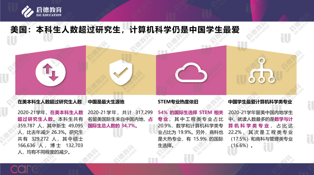 據(jù)2021 《美國門戶開放報告》數(shù)據(jù)顯示,2020/21學(xué)年共有914,095名國際學(xué)生在美國高等教育機(jī)構(gòu)學(xué)習(xí),中國內(nèi)地(317,299人)依舊是美國最大的生源地區(qū),在國際學(xué)生中占比為34.7%,其中本研占比分別是39.6%與37.5%。