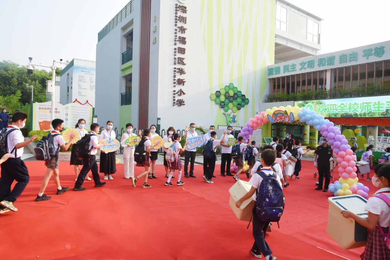 “同學(xué)們好!歡迎你們回家!”9月20日一早,華新小學(xué)校長張偉帶領(lǐng)老師們、家長義工們在校門口迎候四至六年級學(xué)生返校。同學(xué)們背著書包,抱著午托箱,迎著朝陽,踏著紅毯意氣風(fēng)發(fā)走進(jìn)“入學(xué)門”。校領(lǐng)導(dǎo)、老師和家長義工們熱情迎接同學(xué)們平安返校,學(xué)生們從此告別漫長的暑假,開啟新學(xué)期的校園學(xué)習(xí)生活。