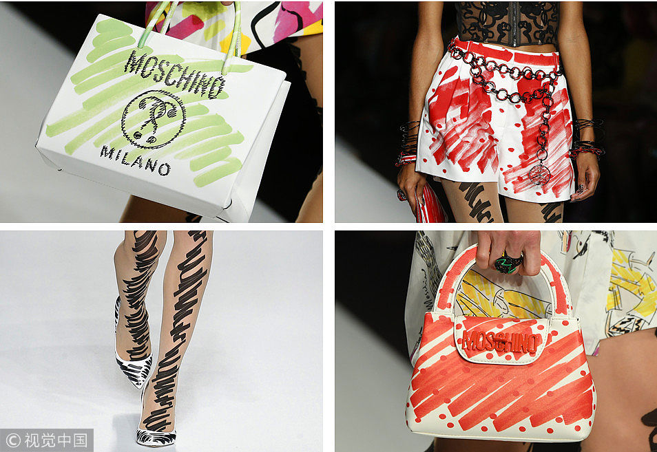 Moschino 2019春夏系列發(fā)布會于當?shù)貢r間20日在米蘭舉行,滿場的涂鴉元素好玩的不得了,信手涂鴉在服飾和配飾上,瞬間放下束縛回歸本真,帶你追憶無憂無慮的孩童時代~ (圖片來源:視覺中國)