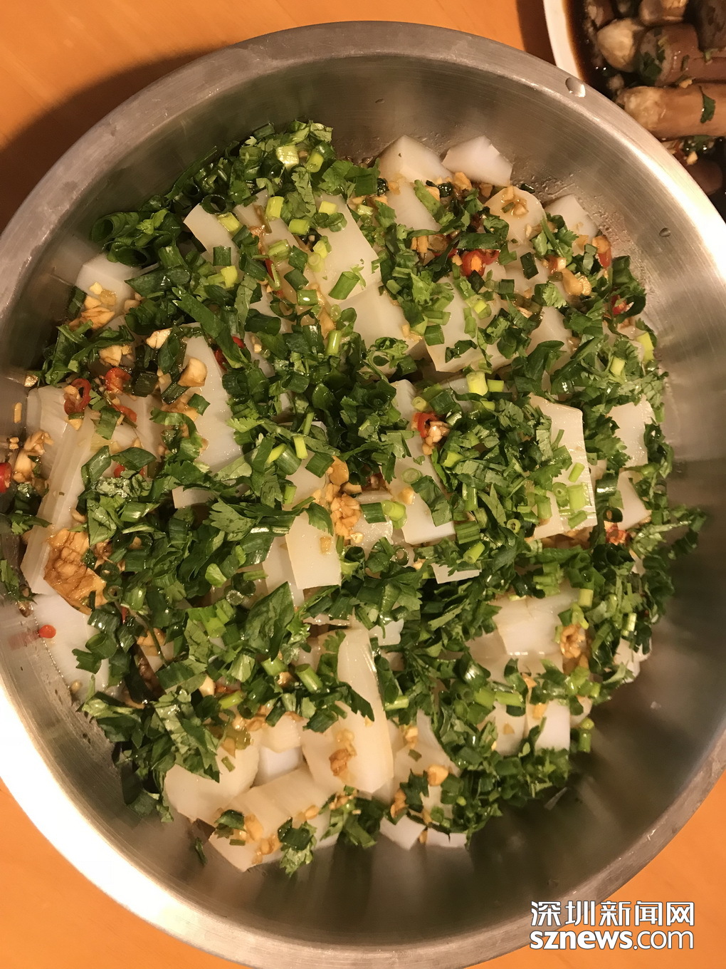 18時(shí)左右,各家各戶陸續(xù)端來飯菜:無錫排骨、酸菜炒豬大腸、客家鹽焗雞、紅燒豬腳……品種豐富,幾乎涵蓋中國(guó)各大菜系。有熱心人做了統(tǒng)計(jì),一共有67道菜呢!